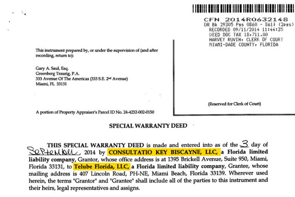 O imóvel está registrado em nome de uma empresa offshore, chamada Telube Florida LLC. O nome da firma é formado pelas sílabas iniciais dos membros da família do ministro.