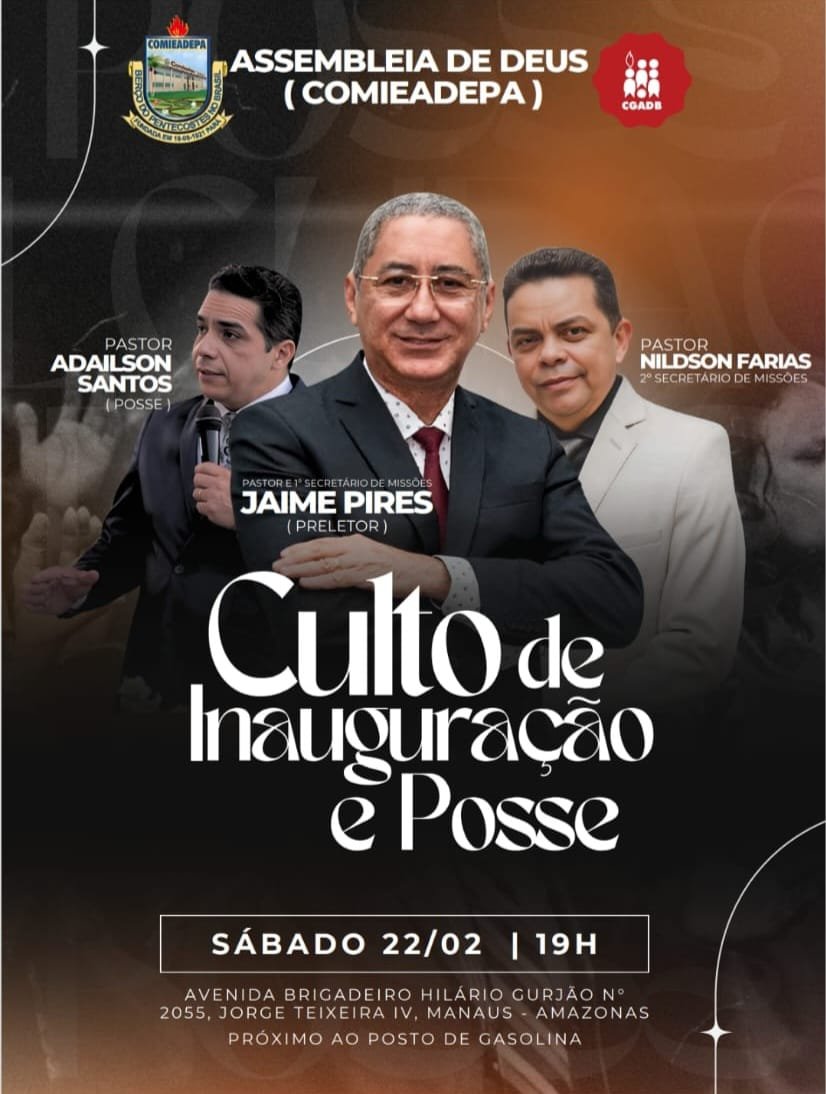 Nesse ato teremos, a presença confirmada os pastores, Pr Jaime Pires ( primeiro secretário e coordenador de Missões ), Pr Nildson Farias ( segundo secretário e coordenador de Missões ) e a posse do Pastor da Igreja Assembléia de Deus COMIEADEPA que acontecerá às 19:00h, na Igreja localizada, na Avenida Brigadeiro Hilário Gurjão, n° 2055, bairro Jorge Teixeira IV, Manaus – Amazonas.