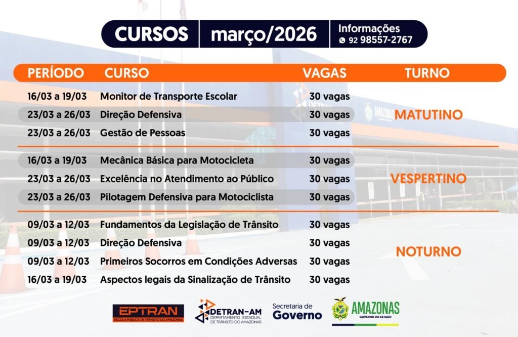 O Departamento Estadual de Trânsito do Amazonas (Detran-AM), por meio da Escola Pública de Trânsito (Eptran), está com inscrições abertas para cursos gratuitos que serão ministrados no mês de março. São oferecidas 300 vagas, com turmas nos turnos matutino, vespertino e noturno.