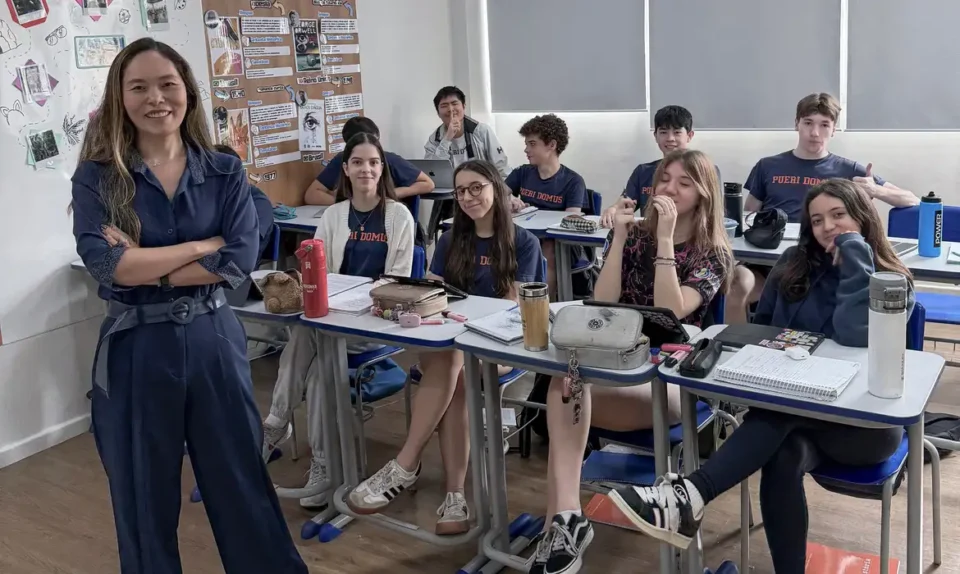 A professora Cintia Etsuko Yamashita, coordenadora pedagógica da Escola Bilíngue Pueri Domus, da Aclimação, em São Paulo, dá dicas aos estudantes – Foto Cintia Etsuko Yamashita/Arquivo pessoal