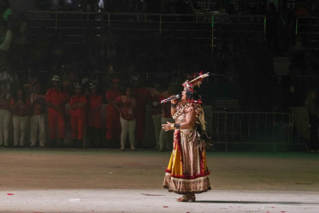 A figura típica regional exaltou as artesãs indígenas, valorizando a mulher originária como guardiã da floresta. E destacou como suas criações artesanais são expressões de resistência cultural e preservação ambiental. A alegoria trouxe a aparição da cunhã-poranga Isabelle Nogueira, liderando uma celebração da força de mulheres indígenas, em mais uma noite marcada por transmutação na indumentária, se transformando em arara.