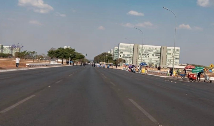 Palco tradicional de manifestações populares em Brasília, a Esplanada dos Ministérios está vazia neste dia de protestos marcados contra o governo de Jair Bolsonaro, em uma situação contrastante daquele verificada há cinco dias, quando um público situado entre 300 mil e 500 mil pessoas esteve no mesmo local para manifestara apoio ao chefe de governo brasileiro.