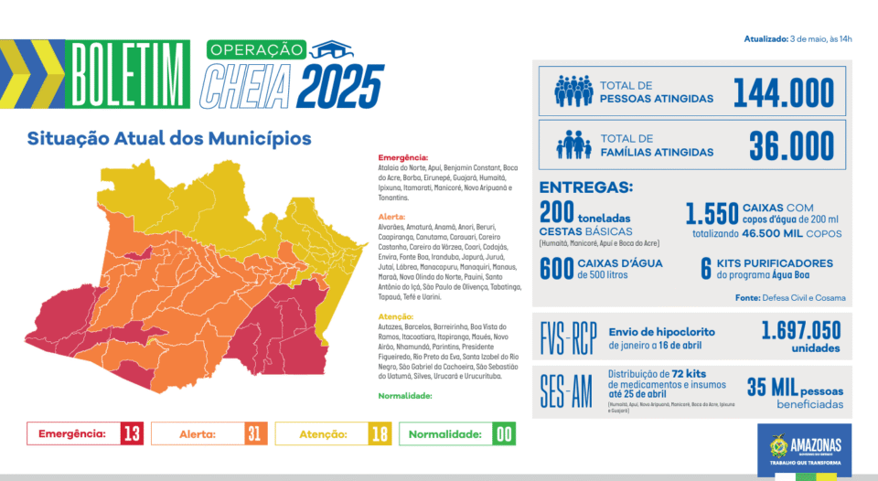 Operacao-Cheia-2025_BOLETIM-CHEIA-25.05.25O Governo do Estado já enviou 250 toneladas em cestas básicas, 600 caixas d’água de 500 litros, 57 mil copos de água potável da Cosama, além de 10 kits purificadores do programa Água Boa para os municípios de Manicoré, Apuí, Humaitá, Borba, Boca do Acre e Novo Aripuanã.