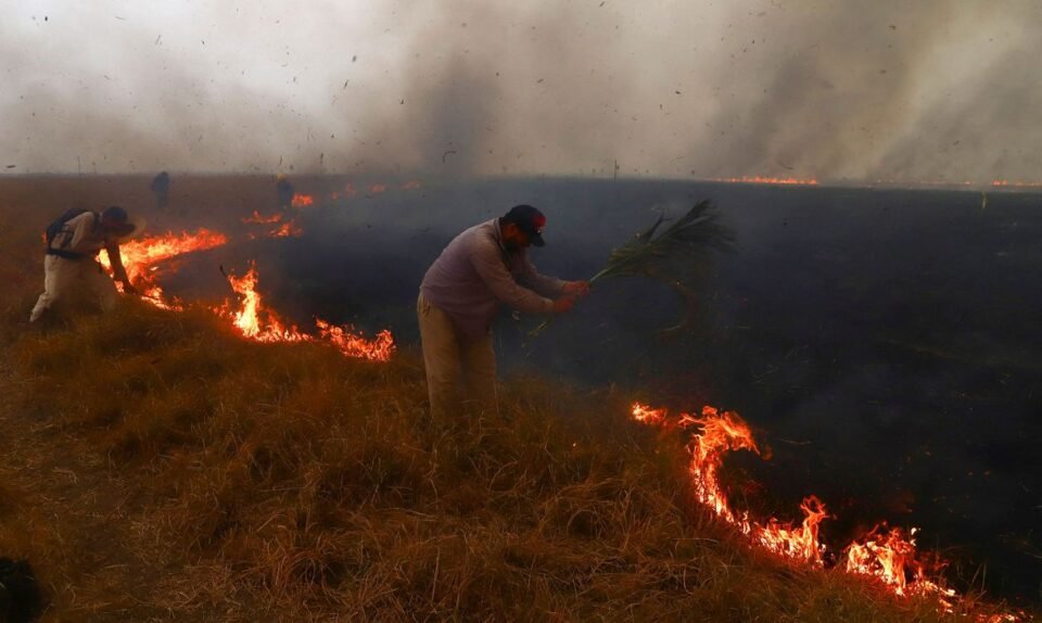 Imagens da região mostraram grandes áreas de campos queimadas, animais fugindo do fogo ou mortos e trabalhadores exaustos lutando contra as chamas.