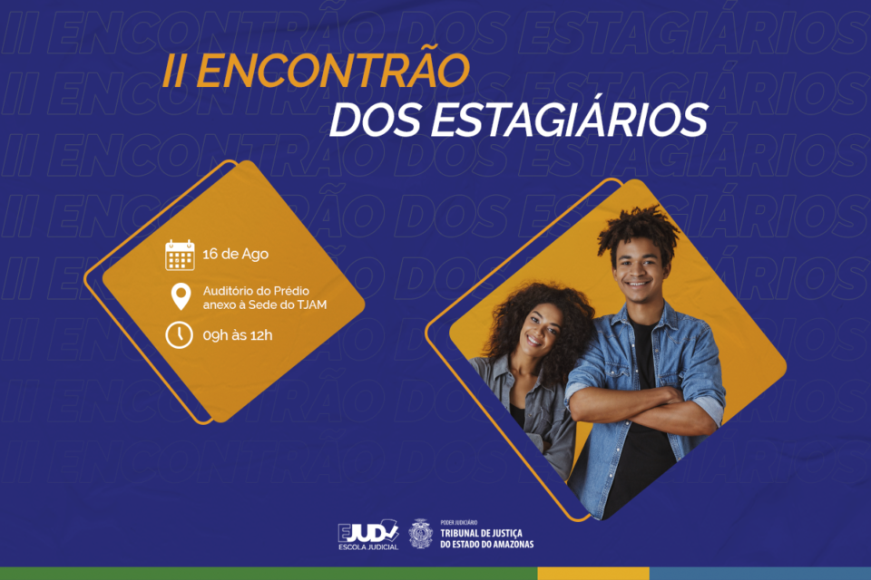 #PraTodosVerem: A imagem que ilustra a matéria é o card de divulgação do evento.Sobre um fundo azul egípicio se lê na parte superior em duas linhas: segundo encontrão de estagiários. Abaixo em dois losangos na cor laranjada, está no da esquerda: o horário, local e data; e no da direita: a foto de um homem e uma mulher jovens. No rodapé estão as logomarcas da Ejud e do TJAM.