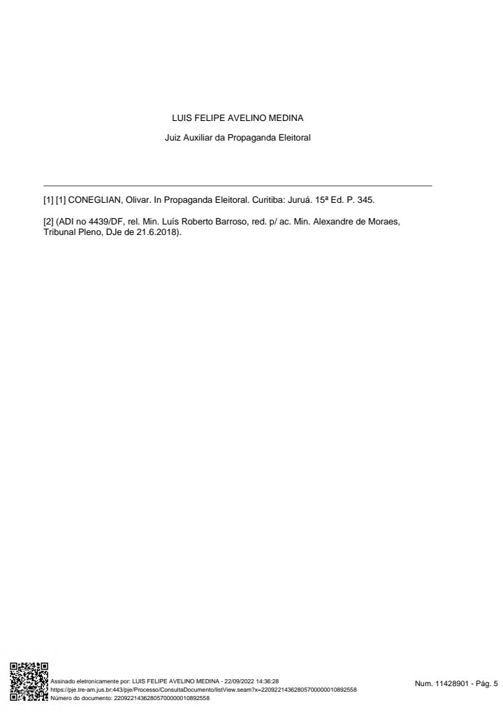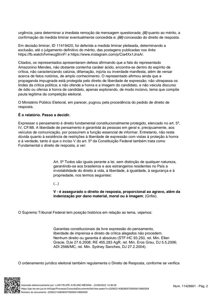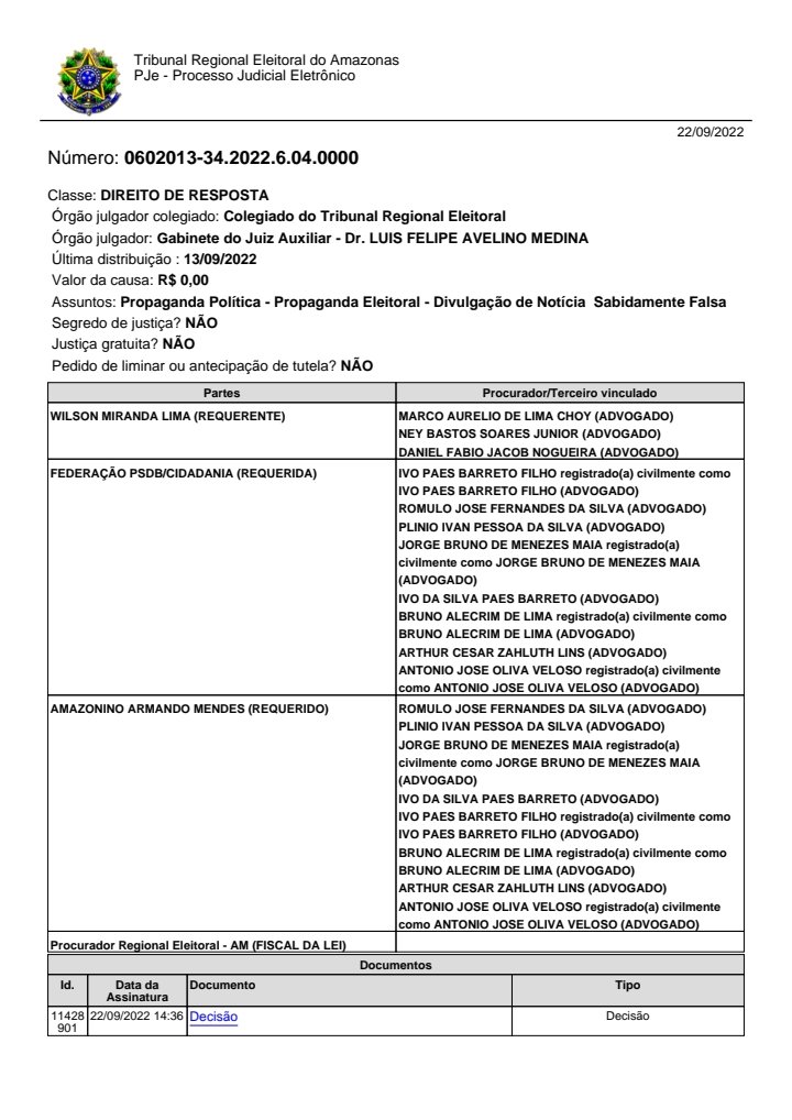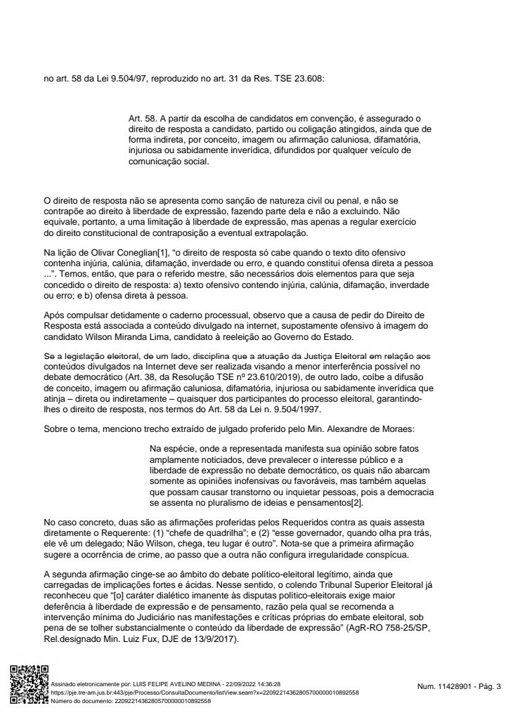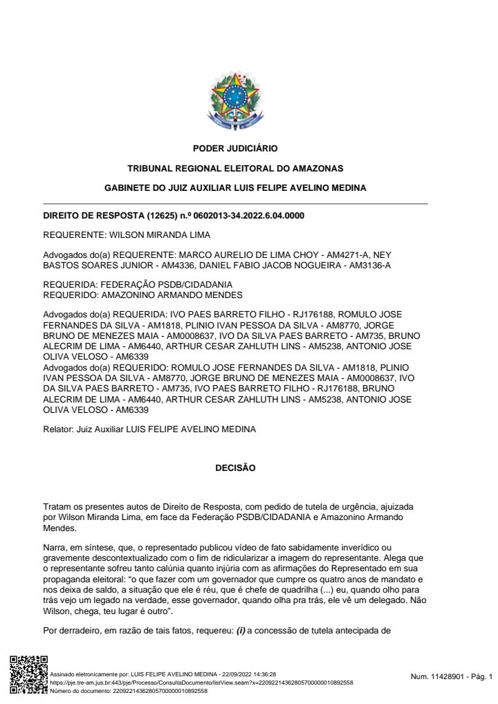 A Justiça Eleitoral concedeu novo direito de resposta ao candidato à reeleição, governador Wilson Lima (União Brasil), ao considerar que o candidato Amazonino Mendes cometeu calúnia e injúria em vídeo em que acusa Wilson de ser “chefe de quadrilha”. A decisão foi proferida ontem (22/09) pelo juiz Luís Felipe Avelino Medina.