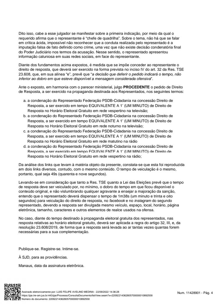 O direito de resposta deve ser veiculado na propaganda eleitoral de Amazonino na televisão e rádio e também em suas redes sociais. A decisão da Justiça também determina que o conteúdo seja retirado do ar em todos os meios de divulgação.