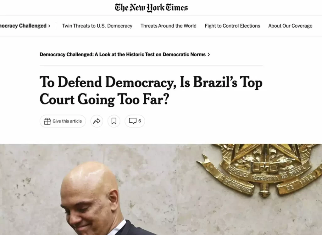 “O Sr. Moraes prendeu cinco pessoas sem julgamento por postagens nas redes sociais que ele disse terem atacado as instituições brasileiras”, relata o New York Times. “Ele também mandou remover milhares de posts e vídeos com pouco espaço para recuros. E, neste ano, dez dos 11 ministros sentenciaram um parlamentar a quase nove anos de cadeia por fazer o que eles chamaram de ameaças [contra o STF] durante uma live”. (continua)