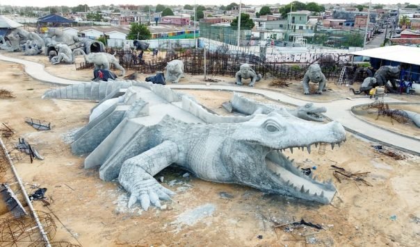 Onças, iguana, macaco e jacarés gigantes têm esculturas esculpidas no parque Amazonino Mendes