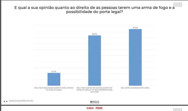 Levantamento exclusivo do instituto Orbis para o Diário do Poder mostra que a posse e porte de armas de fogo tem o apoio da maior parte dos brasileiros; 52,7% são a favor e 47,3% contra armas.