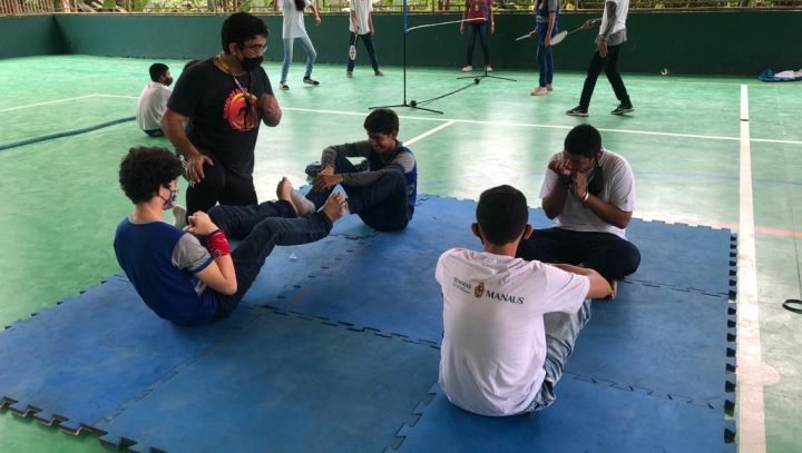 Durante a ação, os alunos participaram de um circuito de atividades físicas e práticas esportivas com badminton, lutas, basquete, entre outras.
