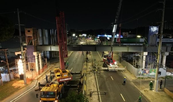 A Prefeitura de Manaus, via Secretaria Municipal de Infraestrutura (Seminf), instalou, na madrugada de domingo, 27/8, uma viga metálica de 20 toneladas que vai servir de base para a nova passarela na avenida Ephigênio Salles, no trecho em frente ao Tribunal de Contas do Estado do Amazonas (TCE-AM). O projeto, que visa desafogar o trânsito na área, chega a 70% de execução.
