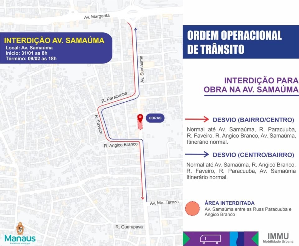 A Prefeitura de Manaus, por meio do Instituto Municipal de Mobilidade Urbana (IMMU), vai interditar, a partir de segunda-feira, 31/1, um trecho da avenida Samaúma, no bairro Monte das Oliveiras, zona Norte. A medida é necessária para que no local seja realizado um serviço de drenagem profunda, executado pela Secretaria Municipal de Infraestrutura (Seminf).