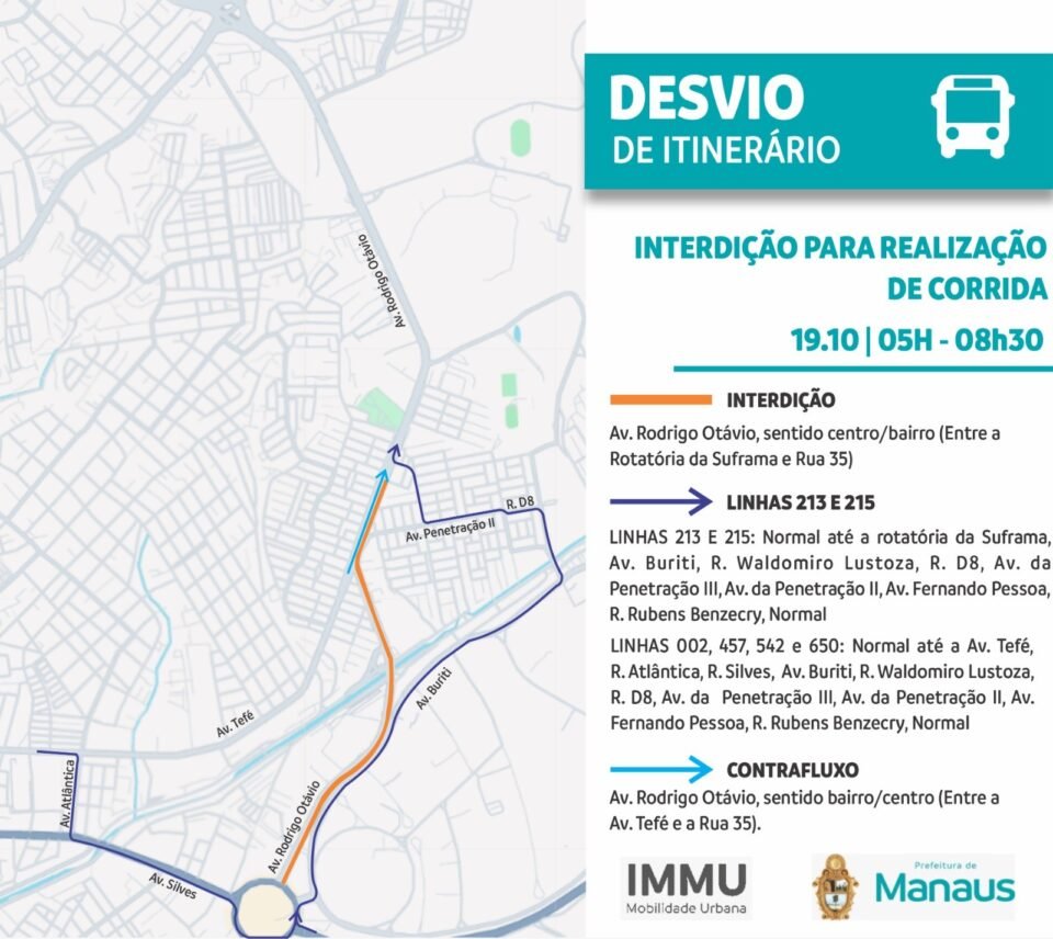 A interdição no sentido Centro/bairro, da avenida Rodrigo Otávio, entre a rotatória da Suframa e a rua 35, ocorrerá das 5h às 8h30, com implantação de contrafluxo no sentido oposto, para garantir a circulação dos ônibus e demais veículos. O IMMU orienta os usuários do transporte coletivo a ficarem atentos às alterações e programarem seus deslocamentos com antecedência.