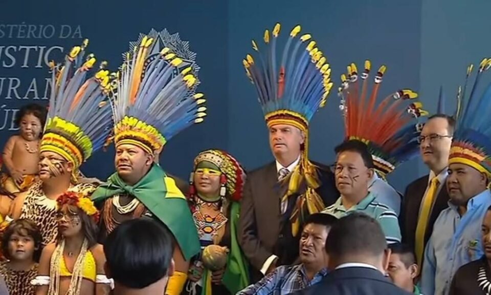 Pouco antes da cerimônia, Bolsonaro, que foi presenteado com um cocar, posou para fotos com alguns indígenas presentes no evento, acompanhado do ministro da Justiça e Segurança Pública, Anderson Torres.