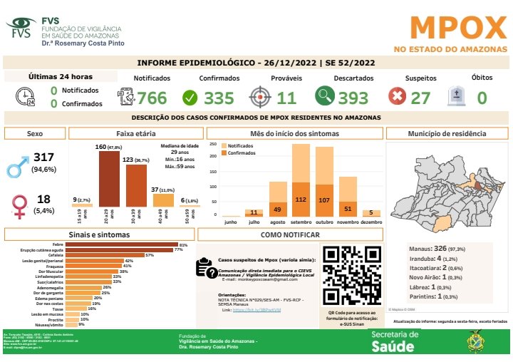 Neste informe, o quadro atual da Mpox permanece com 766 notificações, das quais são 335 casos confirmados, 11 prováveis, 393 descartados e 27 suspeitos. Não há registro de óbito pela doença.