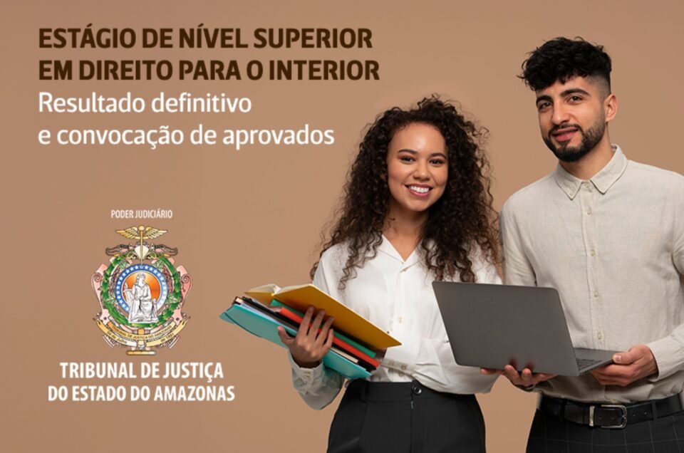 #PraTodosVerem – a imagem que ilustra a matéria mostra dois jovens (uma moça e um rapaz) sorridentes e traz a traz a informação: Estágio de Nível Superior em Direito para o Interior – Resultado definitivo e convocação de aprovados. Logo abaixo desses dizeres, está o brasão do Tribunal de Justiça do Amazonas. A moça tem os cabelos longos e encaracolados; usa blusa branca de mangas compridas e calça do tipo social na cor cinza; e está carregando cadernos e pastas de documentos. O rapaz, que usa o cabelo raspado na base e mais longos na parte superior da cabeça, também está vestido formalmente, com uma camisa de punho, calça cinza com detalhes em xadrex e cinto escuro. Ele tem às mãos um notebook.