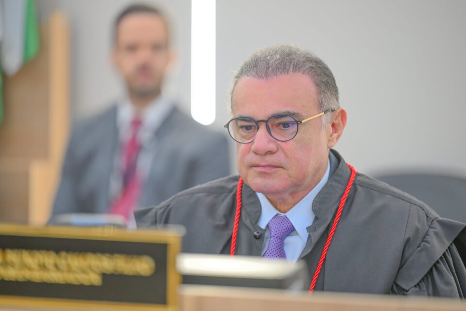 #PraTodosVerem – a fotografia que ilustra a matéria mostra o desembargador Abraham Peixoto Campos Filho. Ele usa óculos de armação redonda preta, com as hastes laterais douradas. Sobre camisa social azul-claro e gravata cuja estampa tem detalhes em azul-escuro e vermelho, ele veste a toga preta da magistratura. A vestimenta tem um cordão vermelho pendendo da gola.