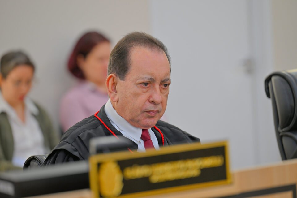 #PraTodosVerem – A fotografia colorida que ilustra a matéria mostra o desembargador Yedo Simões, relator do processo, durante sessão do Pleno. Ele usa toga preta com um cordão vermelho pendendo da gola sobre terno e gravata.
