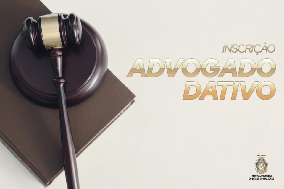 #PraTodosVerem: a imagem que acompanha o texto traz a informação: “Inscrição – Advogado Dativo” ao lado de uma martelo de madeira (com enfeite dourado), normalmente utilizado como símbolo de decisões judiciais. O objeto repousa sobre uma base redonda, também de madeira, a qual, por sua vez, está sobre um livro de capa dura. Na parte inferior direita da imagem, vê-se o brasão do Tribunal de Justiça do Amazonas.